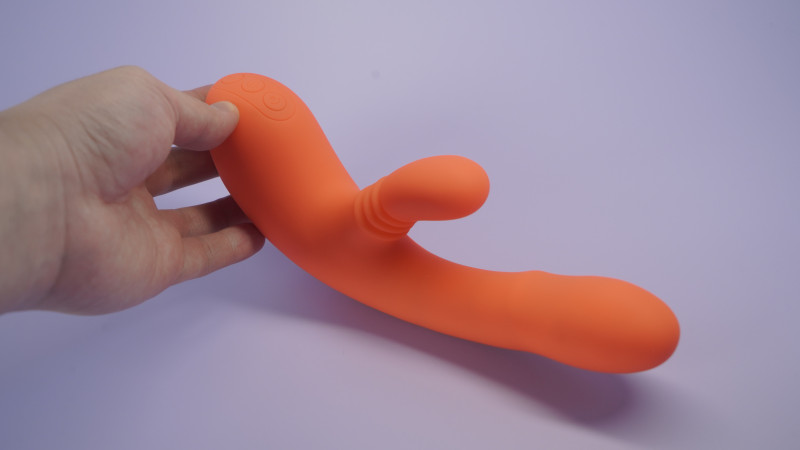 Верхняя кнопка отвечает за включение клторальной части, за включение язычка вращения на 360, единоразовым нажатием на кнопку включения можно управлять дополнительной вибрацией в вагинальной части.
